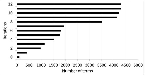 The construction of the dictionary involved several iterations to ensure the inclusion of a comprehensive set of terms in the final version. The procedure was repeated, starting with the automatic part of the algorithm. The evolution of the number of keywords/terms included in the dictionary is shown in Figure 4. Only the terms found in the years 2020 and 2021 were used in the seven initial iterations, as most of the publications occurred in the last two years of the sample (Figure 2). The first Levenshtein ratio was equal to 0.75, which was increased along the iterative procedure until the maximum value of 0.9 (i.e., larger distance between the terms). The following five iterations were performed considering all the keywords/terms returned for the 11-year study period (176,029 keywords/terms). This fact justifies the variation from the seventh to the eighth iteration. The Levenshtein ratio was redefined in the eighth iteration as equal to 0.8 and increased by 0.05 on each subsequent iteration until it reached 0.9. The iterative process was stopped when the list of not-found terms resulting from the filtering process did not contain new keywords/terms to be added to the dictionary with an occurrence of greater than three or a relevance of greater than 5.