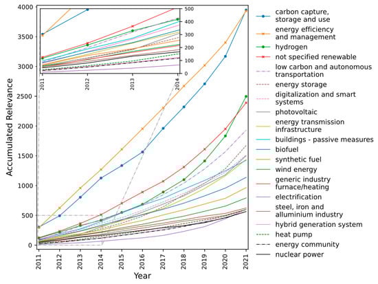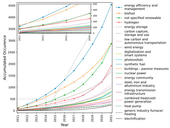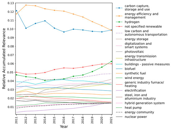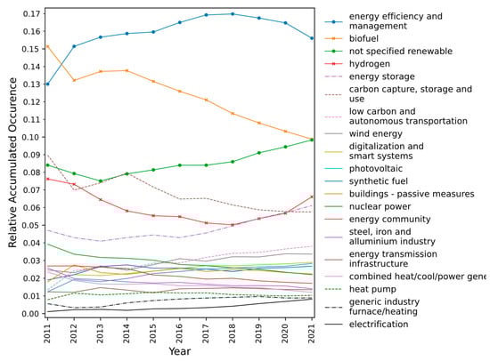 As for relevance, the domains of “energy efficiency and management”, “carbon capture, storage, and use”, “not specified renewable”, and “hydrogen” presented the highest values of relative relevance during the 2011–2021 period. However, the shares of the first two domains have been decreasing significantly, while there is a rapid increase in the case of the “hydrogen” domain. The “energy storage”, “low carbon and autonomous transportation”, “energy transmission infrastructure”, “energy community”, and “electrification” domains have increased their relative relevance values. The “biofuel” and “nuclear power” domains present a decreasing value of relative relevance, along with, surprisingly, “buildings—passive measures”. Concerning the occurrence, the “energy efficiency and management”, “biofuel”, and “not specified renewable” domains appear to present higher values of relative occurrence. However, the two first domains show a decrease in relative occurrence values. The same tendency may be perceived for the “carbon capture, storage and use”, “nuclear power”, and “energy community” domains. After a decrease, the relative occurrence for the “hydrogen” domain began increasing. The relative occurrence is also increasing for the “low carbon and autonomous transportation”, “energy storage”, and “photovoltaic” domains.