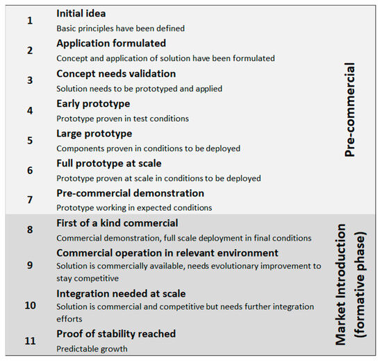 The Technology Readiness Level (TRL) metric was utilised to evaluate the readiness of the technology domains outlined in Section 3.1. The metric utilised adheres to IEA’s scale, using a TRL score from 1 to 11 (see Figure 9). Moreover, for the analysis in this study, the 11 readiness levels have been further consolidated into two distinct groups: technologies in the pre-commercial stage and those in the market introduction stage or the formative phase (cf. [37]).