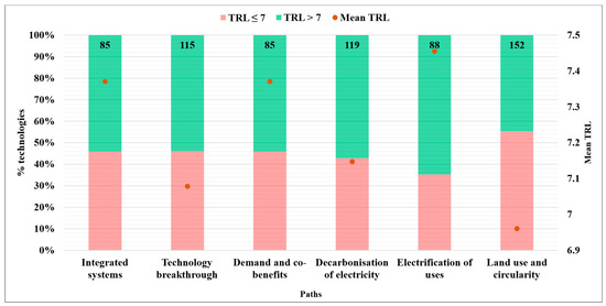 The pathways “Technology breakthrough” and “Decarbonisation of electricity” present similar shares regarding the number and percentage of associated technologies in pre-commercial status. However, the “Decarbonisation of electricity” has a slightly higher average TRL value. The “Integrated systems” and “Demand and co-benefits” pathways have similar shares of technologies in the pre-commercial stage to the other two pathways but with much higher average TRL values.