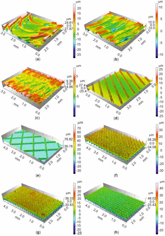 - Smooth and various laser surface textures: three vibration-assisted laser-textured surfaces (#VALS1, #VALS2, and #VALS3) and five novel laser textures (#LS1, #LS2, #LS3, #LS4, and #LS5);