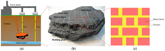 Schematic diagram of the coal structure. (a) Geological sequestration, (b) coal sample, and (c) one of the floor plans.