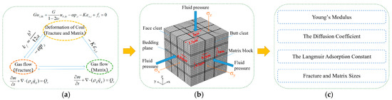The above studies show that the difference in the mechanical properties of the coal mass and matrix controls the variation in coal permeability, but few theoretical models have been conducted on these two factors. In this work, theoretical modeling and numerical simulation are employed to study the impact of fracture and matrix mechanical anisotropy on permeability evolution in various directions. In the second part of the study (illustrated in Figure 2a), coupled modeling was conducted, whereas in the third part (depicted in Figure 2b), modeling was performed. In the fourth part of the study (depicted in Figure 2c), a parametric analysis was carried out.