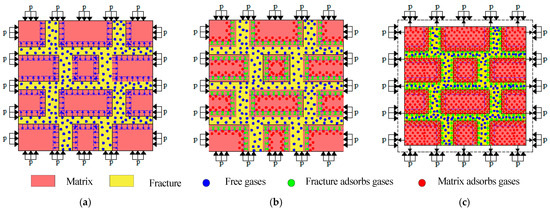 The storage states of gasses include (1) free gasses in fractures, (2) gas adsorbed on the surfaces of fractures, and (3) gas adsorbed within the matrix. During gas depletion, gas follows a sequential flow process: first, the free gas in the fractures is released, followed by the gas adsorbed on the fracture surfaces, and finally, the adsorbed gas within the matrix is released. The redistribution of gas pressure within the matrix facilitates the interaction of substances and stresses between the fracture and the matrix, causing matrix deformation to transition from local to global. When a fracture is filled with CO2 gas, the free gas exerts pressure, generating local strain that increases the fracture aperture. Conversely, gas adsorbed on the surfaces of fractures and the matrix induces matrix expansion, resulting in a decrease in the fracture aperture. The mechanical mechanism of matrix expansion due to adsorption differs fundamentally from that caused by free gas [37].