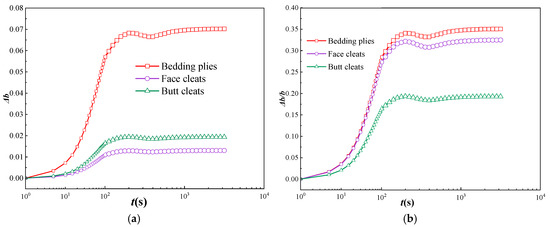 The gas contains numerous fractures, with local strain occurring because of the pressure difference between the fracture and the matrix, leading to an increase in fracture opening. The openings in the bedding planes, surface, and butt cleat directions increase rapidly, with the most significant changes observed in the parallel bedding direction and the smallest increase ratio noted in the face cleat direction, as illustrated in Figure 4a. The ratio of fracture opening to initial fracture opening in the parallel bedding plane is the highest, whereas the smallest ratio occurs in the butt cleat direction, as illustrated in Figure 4b. As gas molecules interact with the fracture wall and diffuse into the matrix, a decrease in fracture opening is observed in all three directions due to gas adsorption strain and pore strain. Once the gas pressure achieves a new equilibrium between subsystems, the fracture expands, resulting in an increase in fracture opening attributed to the global strain effect.