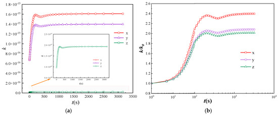 The relationship between the permeability k/k0 and time was simulated numerically. (a) Changes in permeability. (b) The ratio of the change in permeability to the original permeability.