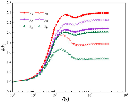 In accordance with the isotropic condition of Young’s modulus, the relationships among the magnitudes of permeability k/k0 are as follows: the largest ratio is determined in the y direction, the x direction, and the z direction. In the context of the anisotropy of Young’s modulus, the relationships among the magnitudes of permeability k/k0 are as follows: x direction, y direction, and z direction. The letters x, y, and z in the figure retain their previously stated meanings, with the subscript “A” indicating anisotropic conditions and the subscript “B” indicating isotropic conditions.