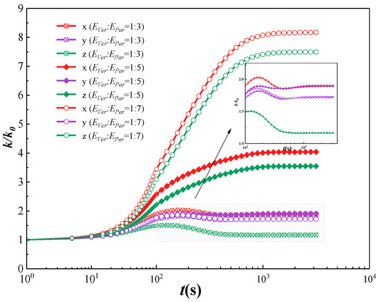 Effect of Young’s modulus with different ratios of vertical bedding plane directions and parallel bedding plane directions on the permeability k/k0.