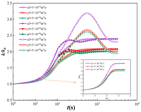Effects of different diffusion coefficients D on the permeability k/k0.