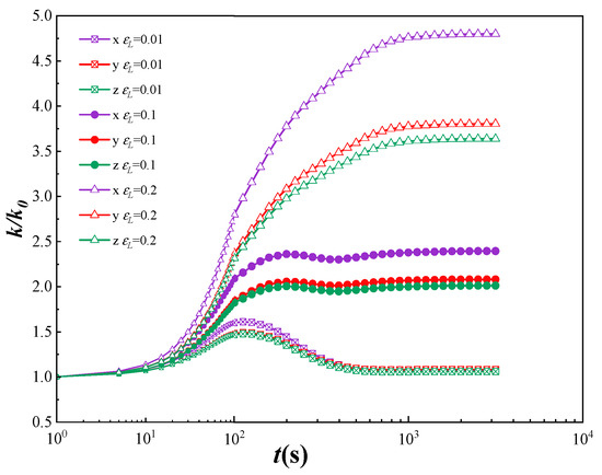 Under the isotropic condition of Young’s modulus, the permeability k/k0 varies significantly among the three directions, whereas Young’s modulus remains uniform across these directions. Additionally, the deformation is similarly influenced by the pore strain in all three directions. The anisotropy of deformation is governed primarily by the adsorption strain. Consequently, the difference in adsorption becomes the main factor contributing to permeability anisotropy. As adsorption increases, deformation also increases, resulting in decreased permeability. This is evident in the case of z-direction adsorption, which is stronger than the weaker adsorption in the y-direction. In the context of the anisotropic Young’s modulus, the effects of both Young’s modulus and the adsorption strain on deformation are clear. The permeability k/k0 in the x direction is significantly greater than that in the y and z directions, whereas the permeability in the y and z directions is of comparable magnitude, as shown in Figure 6.