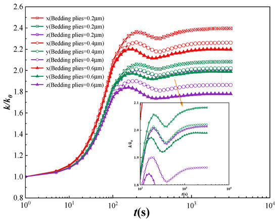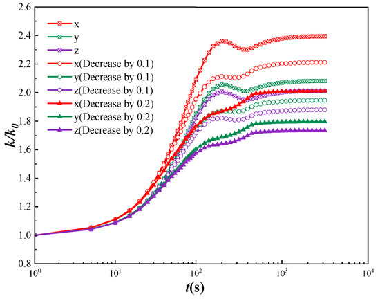 The maximum value of the rising stage, the minimum value of the falling stage, and the equilibrium value of the rebound stage of the permeability k/k0 in the x, y, and z directions decrease with decreasing matrix block size. Furthermore, the time required to reach the maximum value (or the equilibrium value) becomes shorter. In addition, there is no falling stage when the size of the matrix block decreases by 0.2 µm, as illustrated in Table 6. The reduction in the matrix block size leads to a smaller gas adsorption strain and pore strain upon contact between gas molecules and the fracture wall and diffusion into the matrix. The greater the global strain resulting from the gas diffusion process is, the shorter the time required to achieve equilibrium. When the matrix block size remains constant, kmin/kmax is approximately 0.97 and kend/kmax is approximately 1 in all directions. When the matrix block size is decreased by 0.1 µm, kmin/kmax is approximately 1 and kend/kmax is approximately 1.04 in all directions. When the matrix block size is decreased by 0.2 µm, kend/kmax is greater than or equal to 1. Table 6 shows that as the matrix block size decreases, the minimum value of the descending stage increases and becomes less pronounced. Additionally, the rebound stage equilibrium value surpasses the maximum value of the ascending stage.