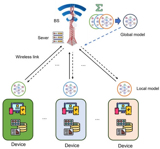 Federated learning (FL) offers a promising alternative by decentralizing the training process. FL technique operates by having a central server distribute global model parameters to remote devices, whereas each device uses its local dataset to update the model [,]. Instead of transferring raw data, which is typically vast and sensitive, these devices send only their locally updated model parameters back to the server []. The server then aggregates these updates, refines the global model, and repeats the process until a desired level of accuracy is reached. This significantly reduces the amount of data exchanged over the network, improving communication efficiency []. The size of model updates is often much smaller than the raw data, which is particularly advantageous for reducing network traffic and latency. Furthermore, FL enhances privacy by keeping sensitive data on local devices, minimizing the risk of data theft or breaches during transmission [,]. In this way, FL provides an efficient, scalable, and privacy-preserving solution for machine learning in distributed environments like IoT networks [].