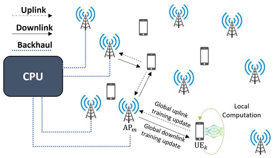 In the context of FL, CFMM enables the accommodation of a large number of served UEs compared with other wireless architectures owing to the support of the mMIMO technique. Additionally, recent studies demonstrate that CFMM can achieve a five-fold gain in spectral efficiency and a ten-fold improvement in energy efficiency compared with small-cell and cellular massive MIMO systems []. Moreover, the distinctive features of CFMM systems, particularly their ability to leverage the cooperative nature of distributed APs, position them as an ideal platform for implementing CFL with energy-saving techniques.