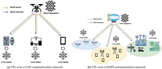 HAPSs also play a critical role in air-ground integration for CFL in intelligent transport systems and edge intelligence networks. Refs. [,] highlighted HAPSs’ ability to combine aerial and terrestrial networks, distributing CFL processes efficiently across 3D networking architectures. Through proper network selection and optimal offloading, these platforms reduce latency and energy consumption in vehicle-to-everything and IoT applications, demonstrating their potential to empower edge intelligence and streamline communication between network nodes.