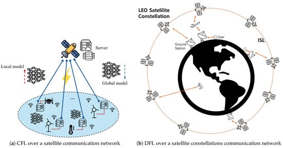 Satellite-based federated learning (SFL) provides global coverage and high scalability, making it ideal for large-scale operations in remote or underserved areas. Satellites excel in fault tolerance and offer persistent connectivity, overcoming limitations such as the restricted battery life of UAVs and the limited coverage of HAPSs. Unlike these platforms, satellites are not constrained by energy limitations or geographical boundaries, making them the most reliable choice for wide-area communication []. SFL is particularly valuable in applications like disaster response, environmental monitoring, and secure global communication, where real-time data processing and privacy are paramount []. In a typical SFL setup, multiple satellites gather data from edge devices while a central server, located on Earth or in orbit, aggregates and processes the model updates [], as illustrated in Figure 5a. This system enables distributed learning across satellites and ground stations, with each satellite or device conducting local computations and sharing updates with the central server.