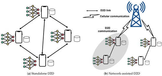 In contrast to CFL, DFL, illustrated in Figure 1b, eliminates the need for a central server to manage the learning process [,]. Instead, each client exchanges model parameters directly with other clients to update its local model. The final model is obtained on an edge device by aggregating local updates from the connected edge clients. In the context of wireless systems, DFL is particularly well suited for wireless systems that utilize device-to-device (D2D) communications []. Like CFL, the primary goal of DFL is to optimize the global parameters by minimizing the global loss function in (1).