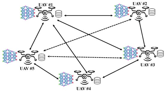 - Pan, D.; Khoshkholghi, M.A.; Mahmoodi, T. Decentralized federated learning methods for reducing communication cost and energy consumption in UAV networks. In Proceedings of the International Conference on Mobile Computing, Applications, and Services, Messina, Italy, 17–18 November 2022; Springer: Berlin/Heidelberg, Germany, 2022; pp. 18–30. [Google Scholar]