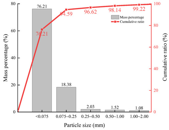 Particle size distribution has an important influence on the structure and mechanical properties of rock mass. In this section, the size distribution of weakly argillaceous cemented rock mass is determined by a screening method. Due to the poor cementation of the sample, it completely disintegrated into a granular form after soaking in water, so the water sieve method was used to determine the particle size. The screen specifications are 0.075 mm, 0.25 mm, 0.5 mm, 1 mm and 2 mm, in turn. See Figure 3 for the distribution of particles with different particle sizes after processing and analyzing the test results. The particle size distribution data of the three groups of samples used in the test are basically discrete, indicating that the particle size distribution of the expansive mudstone in the formation is uniform, and the sorting property is relatively good.