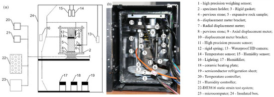 This weathering test adopts a self-developed multi-functional weathering test box that integrates real-time monitoring and control of ambient temperature and humidity, as shown in Figure 4. The system can achieve accurate control of ambient temperature and humidity and can effectively monitor the expansion characteristics, quality changes and macro-appearance changes of samples in different weathering processes. The temperature control range of the test system is 0 °C~60 °C, and the control accuracy can be maintained at 0.1 °C. The control range of the system humidity control module is 0~100% RH, and the control accuracy is 0.5% RH. The range of the displacement meter is 10 mm, and the test accuracy can be maintained at 0.001 mm. The range of the pressure sensor is 0~500 kPa, and the test accuracy is 0.05 kPa. The measuring range of the high-precision micro-weighing sensor is 500 g, and the sensor accuracy is 0.001 g. The DH3816N static strain test system used in data acquisition is produced by Donghua Company, and the supporting software is DH38A.