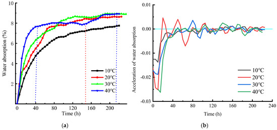 When the relative humidity in the test device is constant at 80% RH, the change in water content of expansive argillaceous rock samples dried at 10 °C, 20 °C, 30 °C and 40 °C is shown in Figure 5a, respectively. The acceleration of mudstone water absorption can be obtained by taking the second derivative of the mudstone water absorption curve, as shown in Figure 5b.