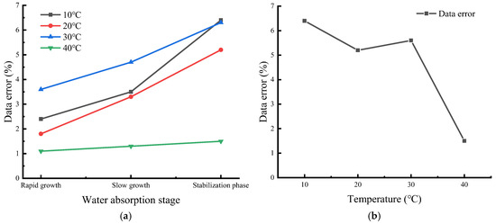 When the humidity field is constant at 80% RH and the test temperature is low, the discreteness of the water absorption data of the three samples in the same group is 6.4% when the temperature field is 10 °C. Later, with the increase in the test temperature field, the discreteness of data monitored by the samples in the same group gradually decreases, which is 5.2% and 5.7%, respectively, at 20 °C and 30 °C. When the temperature field increases to 40 °C, the discreteness value rapidly decreases to below 1.7%, a decrease of more than 70% compared with 30 °C. By analyzing the discreteness of mudstone water absorption, Figure 6 can be obtained.