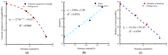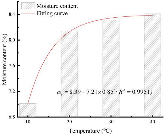 Under the constant humidity of 80% RH and different temperatures, the moisture in the air is fully absorbed after sufficient time. At the temperature of 10 °C, the moisture content at the end of the test is 7.01%. At this time, the compressive strength of the mudstone sample is 13.71 MPa, and the corresponding elastic modulus is 86.84 MPa. With the increase in ambient temperature, when the temperature reaches 20 °C, the water content at the end of the test is 8.11%, the rock compressive strength is 12.68 MPa and the corresponding elastic modulus is 74.15 mpa. Based on the experimental data of 30 °C and 40 °C, the following conclusions can be drawn: the increase in temperature will increase the water content, reduce the compressive strength and reduce the corresponding elastic modulus of expansive rock under the same test conditions [29].