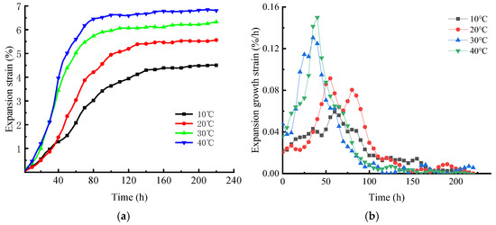 Relationship between expansion strain and time under different ambient temperatures. (a) Time history curve; (b) growth strain of expansion rate.