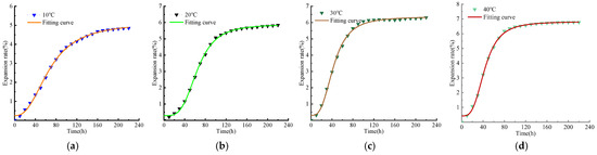 Time history curve fitting of the expansion rate at different ambient temperatures. (a) T = 10 °C; (b) T = 20 °C; (c) T = 30 °C; (d) T = 40 °C.