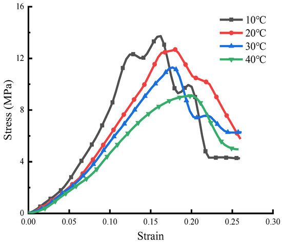 The uniaxial compressive test stress–strain curve of expansive mudstone is obtained through the water absorption test under constant humidity and different temperatures, as shown in Figure 10. Different temperature environments correspond to different water contents of rock samples. With the increase in water content, the curve characteristics are different.