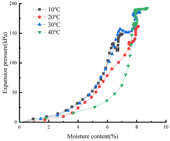 3.4.3. Evolution Law of Expansion Pressure and Water Content Under Different Temperatures