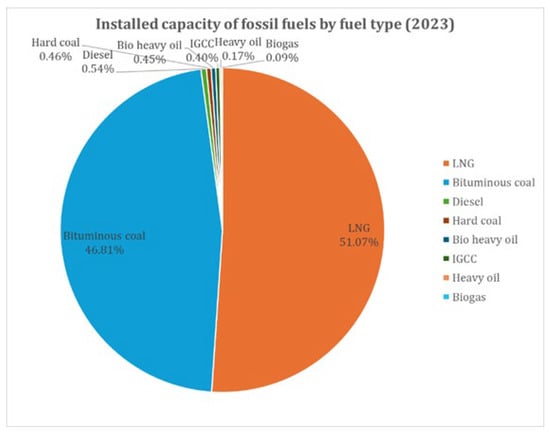 Although there are various fuel types used for fossil fuel plants, this paper will focus on CPPs burning bituminous coal. Figure 3 shows the portion of fuel types for fossil fuel plants in South Korea. The installed capacity of bituminous coal and liquid nitrogen gas (LNG) is 40,290 and 43,953 MW, respectively, together taking up more than 97% of the total installed capacity of fossil fuel in power generation sector [13]. Other fuel types, such as diesel, hard coal, and bio-heavy oil, will not be considered in this analysis, as their contributions are less substantial.