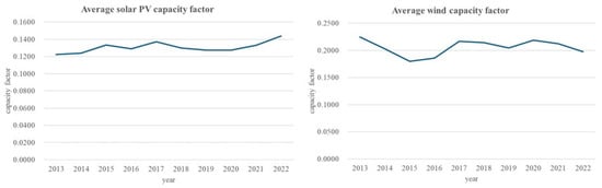 For the capacity factor of VRE, the average capacity factor measured in South Korea from 2013 to 2022 was used. Figure 4 shows the capacity factors of solar PV and wind power generation by year. On average, solar PV operated at a 0.13 capacity factor, while wind power operated at a 0.2 capacity factor. SMRs, on the other hand, the actual capacity factor, is not known since it is under development stage. As South Korea does not have the experience of operating SMRs, it is challenging to determine an accurate capacity factor. Instead, it is possible to refer to large-scale nuclear power plants capable of load-following operations. France is a representative country operating large nuclear power plants for load-following. This study assumes that the capacity factor of French nuclear plants is equivalent to that of SMRs. As of 2023, France’s nuclear power plants had a capacity factor of approximately 67.3%, which is lower than the 80.2% observed for South Korea’s baseload nuclear plants [14]. This capacity factor value was used to calculate the installed capacity for SMRs.