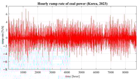 Using the hourly coal power generation profile, the power ramp rate can be estimated. Since there is no power generation profile with sub-hourly time resolution, the hourly profile is used at best. Using Equation (3), the hourly ramp rate(t) of CPP-generated electricity can be calculated for the year 2023. The ramp rate detailed in Equation (3) was derived from the cumulative power generation of all thermal power plants in South Korea. If the ramp rate had been calculated based on the power generation of individual units, it is probable that the ramp rate would have been higher.