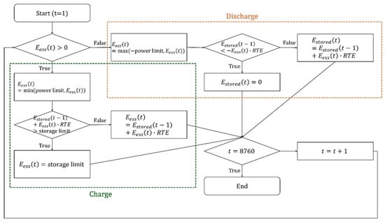 - For t = 0 to t = 8760 h, iterate the process depicted in the diagram of Figure 8. If Eess (t) at time t is positive, it means that the VRE is producing excess energy compared to the demand. Thus, shall be charged to the ESS considering the charging efficiency. However, there are several conditions to be considered during the charging, such as the maximum power limit or the storage capacity limit. For instance, if the storage is full but the VRE is producing excess energy, the situation is defined as “surplus”.
