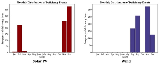 Figure 9 displays a histogram showing the monthly distribution of deficiency events when the target deficiency portion is set as 10%. The left side represents the case of replacing with solar PV and the right side with wind. For solar PV, it was observed that most deficiencies occur during the months with less sunlight (November to December and January to March), particularly with a high frequency in December. Conversely, for wind, most deficiencies occurred between August and December. While wind power generation generally decreases in summer and increases in winter, its strong variability can lead to a lack of clear seasonality.