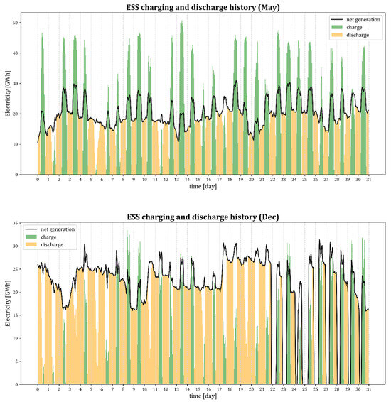 ESS charging and discharge history on May (top) and December (bottom) when replacing CPPs with solar PV.