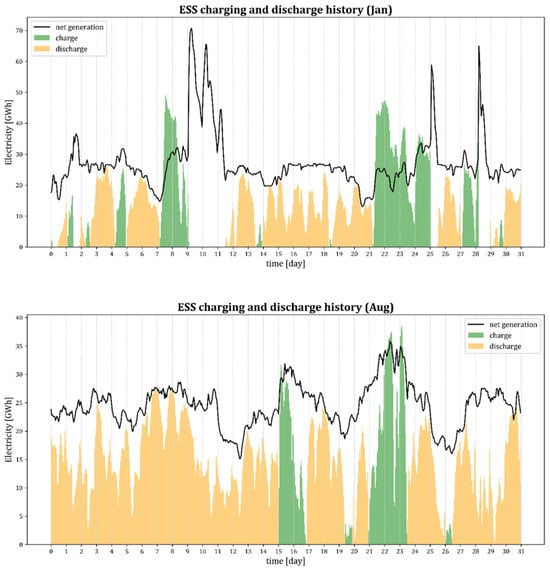 ESS charging and discharge history on January (top) and August (bottom) when replacing CPPs with wind energy.