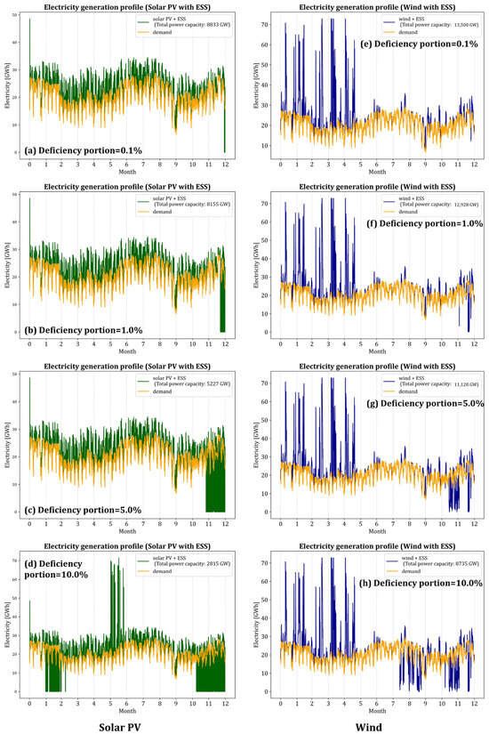 Lastly, Figure 12 shows the annual net generation along with the existing coal-fired power generation, i.e., demand, for each target deficiency portion. The left side represents the scenario where solar PV + ESS is substituted, while the right side represents the scenario where wind + ESS is substituted. For solar PV + ESS, it appears to closely follow the coal-fired power generation (depicted as the orange plot labeled “as demand”) relatively well. However, as the deficiency portion increases, points of generation inadequacy become more pronounced during the winter season. On the other hand, for wind + ESS, there were frequent occurrences where the net generation profile deviated from the demand. Particularly, there were frequent cases of excess production occurring between January and April, which may lead to curtailment of the wind-generated power.
