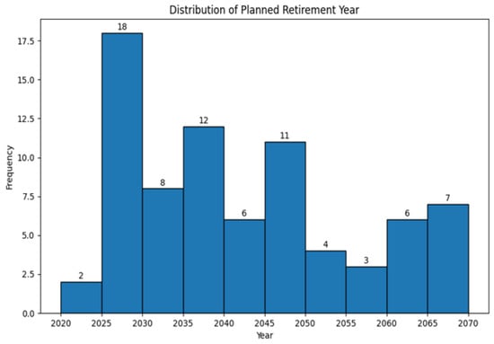 Figure 13 shows the distribution of retirement dates for the 77 thermal plants scheduled to retire after 2023. The majority of thermal power plants scheduled for retirement beyond 2040 began operation in the 2010s or later. Including these plants does not align with the purpose of repowering, which reduces carbon emissions from replacing aging thermal plants. Therefore, the focus was shifted to the 40 plants retiring before 2040, and these were redistributed based on the operating capacity.