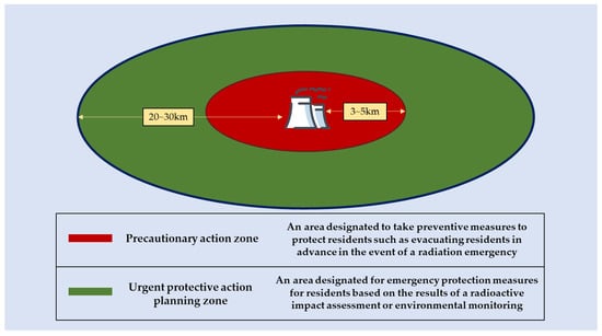 Emergency Planning Zone (EPZ) is an area designated to prepare for uncontrolled releases of radioactive material by evacuating residents or distributing radiation protection drugs (Figure 26). Generally, EPZ is divided into two sections: Precautionary Action Zone (PAZ) and Urgent Protective Action Planning Zone (UPZ). PAZ is an area designated for preventive measures in radiation emergency situations, such as resident evacuation. UPZ is an area set aside for emergency protection measures, which are implemented based on radiological impact assessments and environmental monitoring.