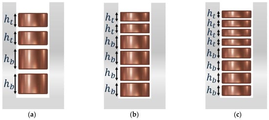 According to [20], the heights of the hairpins that are near the slot opening will be decreased by and the height of the rest of the hairpins will be increased by . Figure 2 shows how the principles of asymmetric hairpin windings would be applied when the slot contains different numbers of layers. The equations for the top and bottom layers that are used to apply asymmetric hairpin winding are listed in Table 1, which shows the rules that apply to each number of layers per slot.
