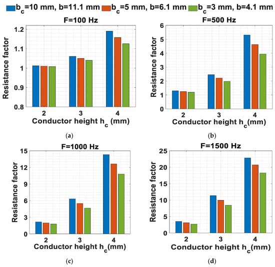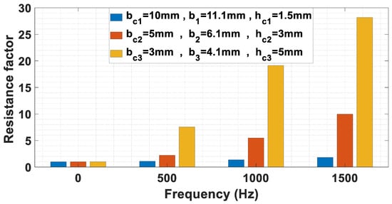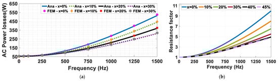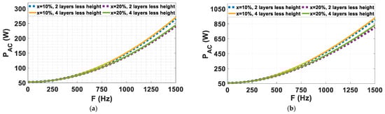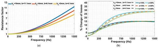 The same analysis that is performed for a 4-layer winding will be repeated in this section for a 6-layer winding to investigate the effect of the number of layers on losses. The values of and for each value of are calculated according to the equations of Table 1, but should be chosen first to decrease the losses. Therefore, the comparison between the two values of is presented in Figure 7a for and . It can be noticed that the use of two top layers with reduced height results in minor losses. To generalize the rule, the same comparison is performed for different dimensions with increased height and decreased width, as shown in Figure 7b, and the same conclusion is obtained. The equations related to from Table 1 are used. The analytically calculated for each case of over the range of operating frequency from 0 to 1500 Hz is shown in Figure 8. It can be noted that after , the decrease in the losses is not noticeable at high frequencies, but on the contrary, the losses are increased at low frequencies.
