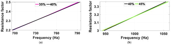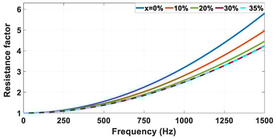 The values of and for each value of are calculated according to the equations of Table 1. The power losses per slot ( for a 4-layer winding are shown in Figure 3a. The results of the analytical model are validated at several points with the finite element method (FEM) using Ansys Maxwell. 2022. The third curve for each case of is the interpolation (Intrpl) of the FEM results. Different values of height reduction are introduced in Figure 3b. It can be noticed that the increase in leads to a decrease in the resistance factor at high frequencies. However, there is a crossover frequency. Below this frequency, the increase in leads to an increase in the power losses, which leads to an increase in From the curves of and , it can be observed that for frequencies > 730 Hz, results in lower values of . While for frequencies < 730 Hz, results in higher values of than in the case of as shown in Figure 4a. The same can be observed in Figure 4b for and at . Which means that for operation below , the use of asymmetric winding with results in more losses.