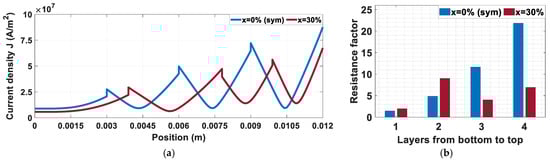 The reduction in the loss while using asymmetric windings can be analytically interpreted as in Figure 5 for a frequency of . The blue curve in Figure 5a shows the tendency of the current density distribution to nonuniformity towards the slot opening because of the increasing effect of skin and proximity effect. Where the leakage flux around the bottom part of the slot is higher than the leakage flux around the top of the slot, as the first passes easily through the iron. The use of the reduced height () for the two top layers results in a reduction in the current uneven distribution, which leads to a reduction in the losses as in (3). The reduction in the value of the resistance factor for the two top layers results in a reduction in the resistance factor for the slot, as in Figure 5b.