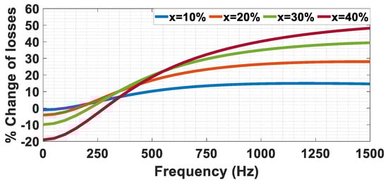 A certain value of for each frequency results in minimum losses. The power losses for symmetric design ( at , height reduction for minimum losses (, the minimum power losses ( at , and the percentage decrease in losses (% at for some values of frequency are introduced in Table 3. It is proved that there is no specific value of that will result in the same percentage decrease in losses for the whole frequency range. The percentage change in losses over the whole frequency range for some values of compared to the symmetric is shown in Figure 6. The positive value of the percentage means a decrease in the losses. The choice of according to this result will depend on the application. If the motor will be used in a race car when very high speeds and high frequencies are required all the time, then higher values of will be the best choice. If the motor will be used within a normal city car, then lower values of will result in a good decrease in losses over the whole frequency range. The negative value of the percentage decrease in losses means that at this frequency, results in an increase in the losses, so care must be taken in the determination of , otherwise choosing for a city car will increase the losses.