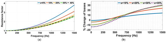 As previously carried out for 4-layer and 6-layer windings, the same study is carried out for 8-layer windings. It is found from Figure 10 that reducing the height of the top 4 layers of the 8-layer winding results in fewer losses. The equations related to from Table 1 are used for the calculations of and . The analytically calculated for each case of is shown in Figure 11a. The percentage change in power losses for some values of is shown in Figure 11b. It can be noticed that increasing the number of layers per slot results in a shift of the curves of the percentage decrease in the losses to the right. This means more frequencies under an increase in the losses.