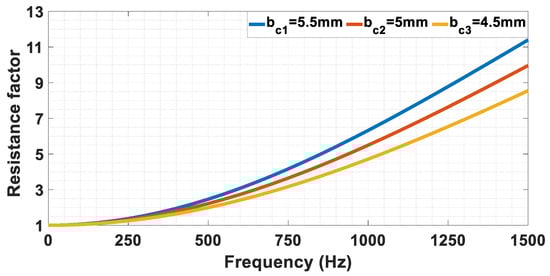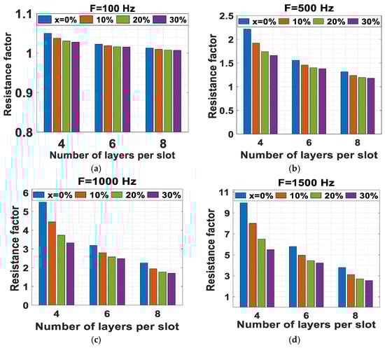 The AC power losses and the resistance factor are calculated analytically for three cases of the number of layers under different values of height reduction to choose the best value. The total cross-sectional area within the slot is the same for all the cases; the layers within the slot are assigned to the same phase, which is the worst-case condition from the point of view of losses, and the same current density is guaranteed for all cases [21]. So, the DC power losses will be the same in all cases. For 4-layer winding, 150 A will be passed in the winding; for 6-layer winding, 100 A will be passed, and for 8-layer winding, 75 A will be passed. Note that the resistance factor is not affected by the value of the current, but the power losses are affected as in (3) and (7). The basic parameters of conductor width and slot width for all cases of number of layers are introduced in Table 2.