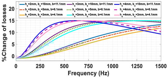 In this investigation, the , and form Figure 1 are changed. The initial DC power losses are kept the same for each case by changing the current. As shown in Figure 14, the change in the height results in a major difference in the power losses. The percentage decrease in losses differs massively because of the change in the value of the height as shown in Figure 15. It can be concluded that the change in the width has a minor effect on the percentage decrease in the losses, while changing the height has the major effect. Also, for all the widths and heights for a specific value of , there is a maximum value of percentage reduction in losses that they all reach but at different frequencies.