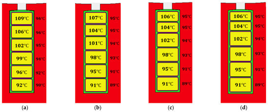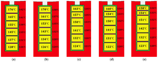 The temperature decreases with asymmetric winding at 2000 Hz: (a) ; (b) ; (c) ; (d) ; (e) .