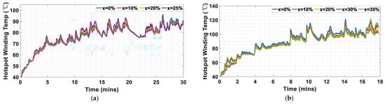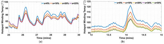 A zoom-in of Figure 24 to show the effect of on the hotspot temperature: (a) WLTP class 3; (b) Artemis Motorway 150.